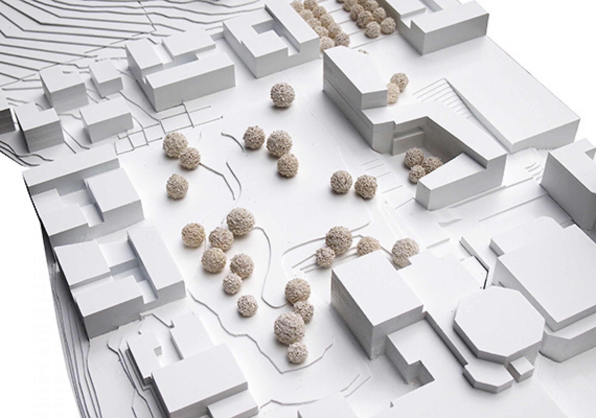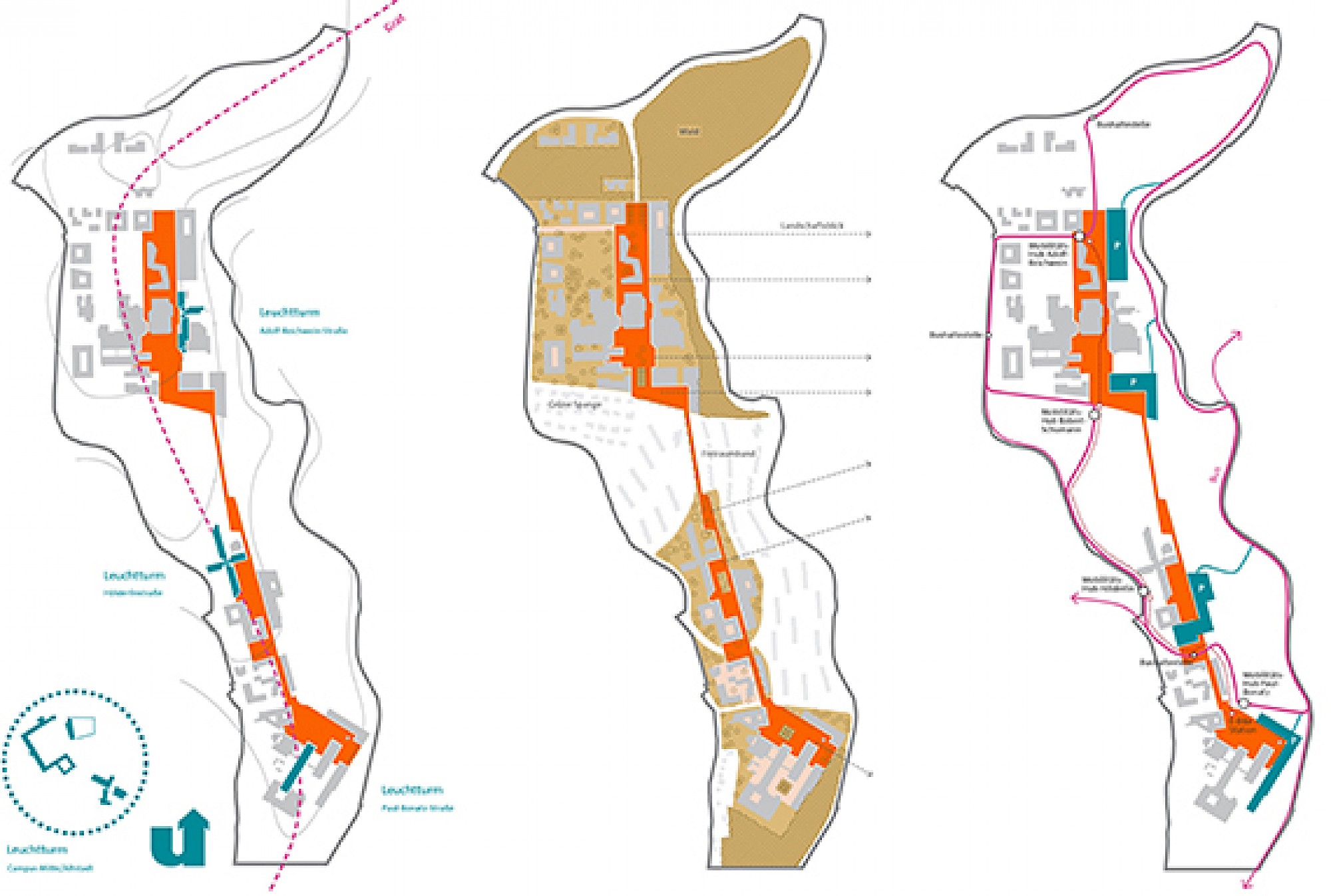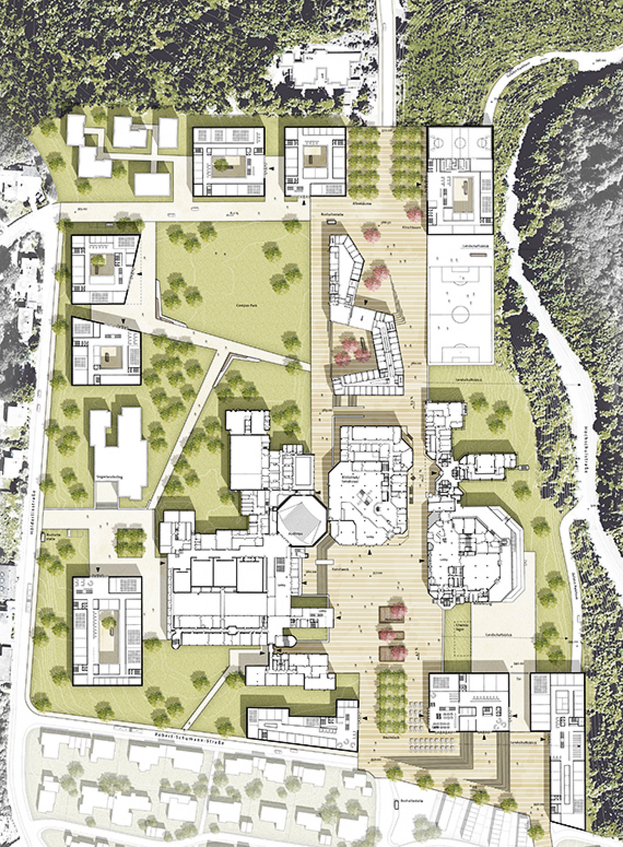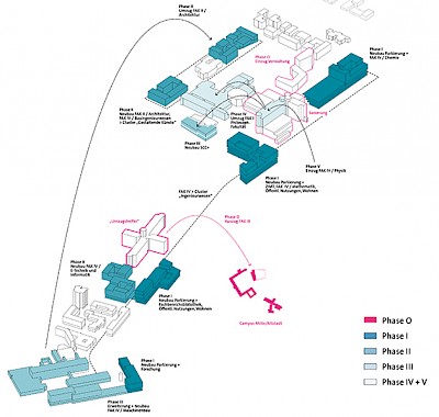 Die neue Bebauung der Fakultäten am Haardter Berg-Campus konzentrieren sich entlang des Campusbandes. Die weichen und harten Räume zwischen den Gebäuden sind einerseits räumlich Teil des Campusbandes und öffnen sich zu diesem, andererseits bilden sie die Übergänge zur umgebenden Wohnbebauung und darüber hinaus. Sie bilden die öffentlichen und halböffentlichen Räume für die Nutzer, vergleichbar mit denen eines klassischen städtischen Blocks. So ergibt sich eine horizontale Verschiebung der konventionellen Schichtung, der "Blockinnenraum" wird Teil der Landschaft, die Plätze werden zu einem "inneren Außenraum."