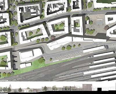 Der baulich räumliche Kerngedanke ist das „choreographierte Weiterbauen“ der Nordstadt – Typologie des Blockrandes. Aus dieser Strategie lässt sich auf das Ganze schließen und die Stadt wird wie selbstverständlich an die Bahn geführt.