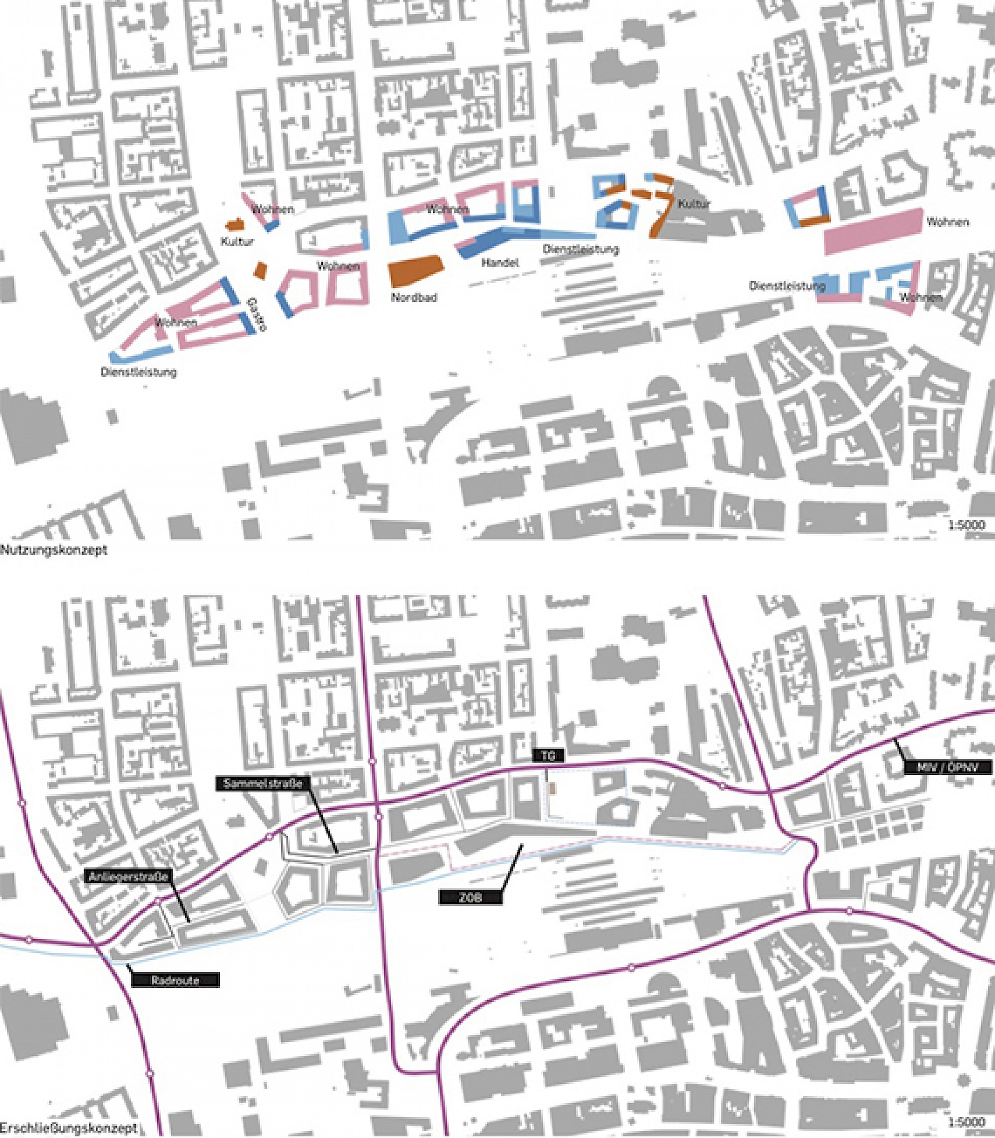 Verschiedene Teilquartiere werden in Form von zusammenhängenden „großen Blöcken“ aus der Umgebung abgleitet und in sie eingebettet. Mit klaren Raumkanten nach außen und kleinteiligen Strukturen in den „Innenbereichen“ in Form von Straßen und Gassen. So ergibt sich eine Gliederung des neuen Quartiers in einzelne Nachbarschaften.