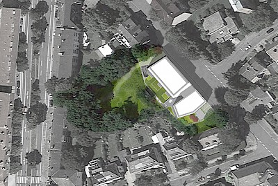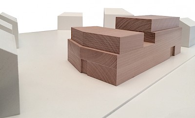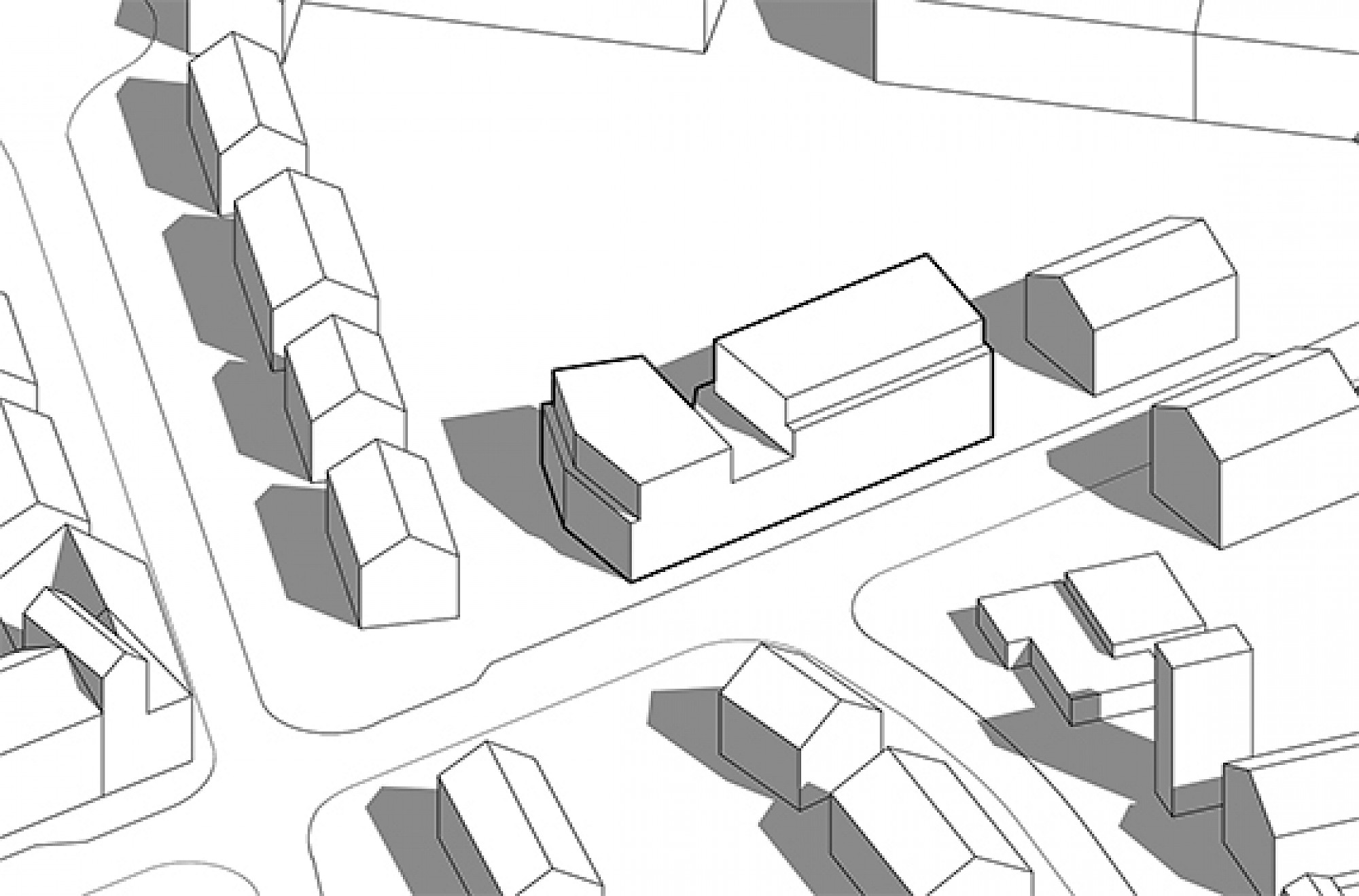 BAUKÖRPER - Der Baukörper bildet zwei eigene Bereiche, einen intimen, innenhofartigen Bereich vor dem südlichen Zugang und einen offeneren Bereich des Wohnungsbaus an der Straße. Erschlossen werden beide Wohnbauteile jeweils durch eine eigene Spännererschließung und beide Teile folgen einer eigenen inneren Logik. Zugleich sind sie aber, in einer Nutzungsalternative als ein zusammenhängender Wohnungsbau zu verstehen und mit einer internen Zonierungsachse strukturiert.