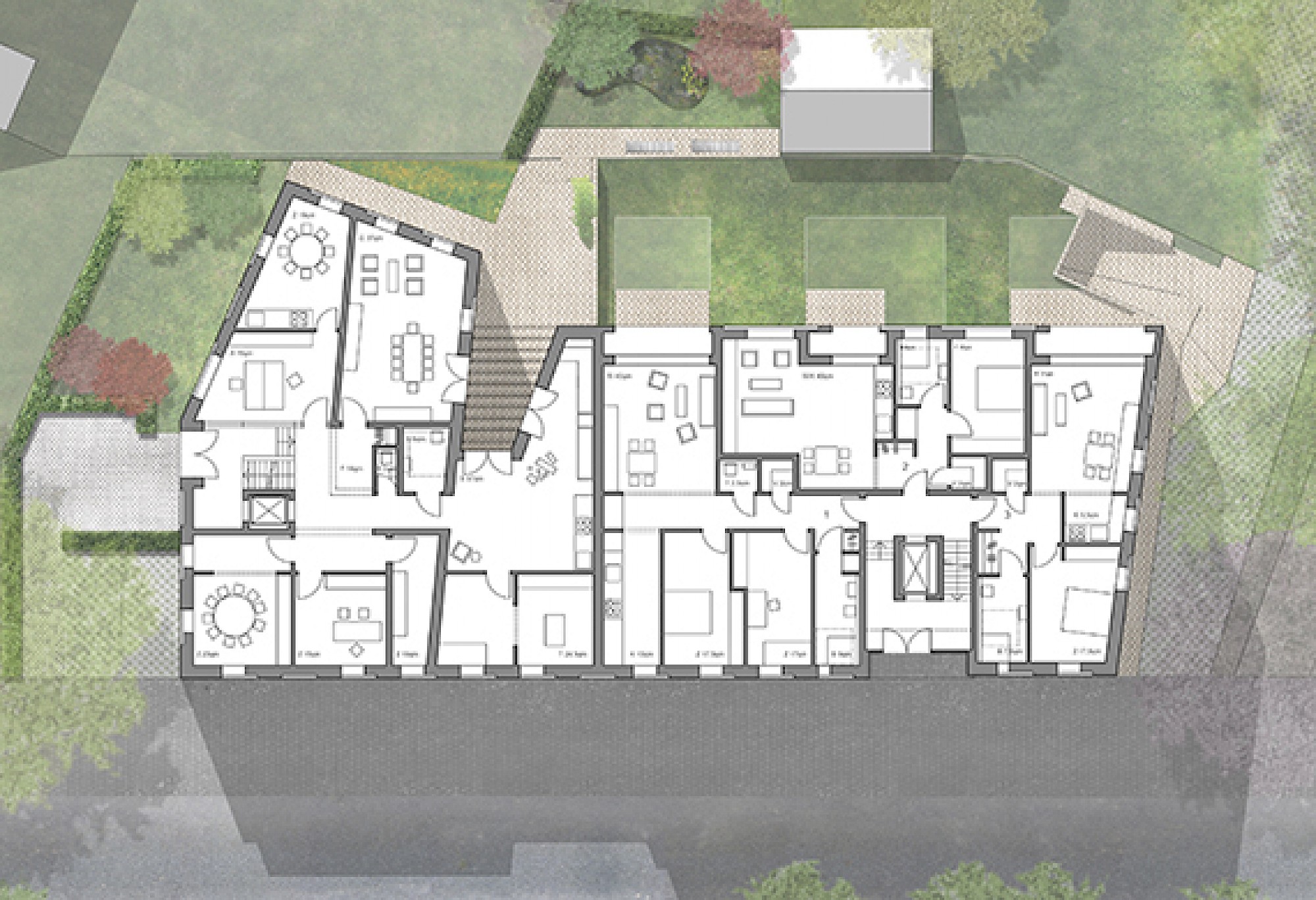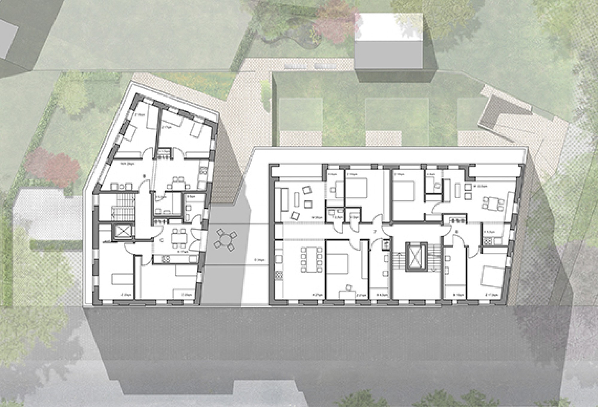 FLÄCHEN - Durch diesen so strukturierten Baukörper ergeben sich, bei einer BGF von 2.857qm, fünf + zehn Wohneinheiten inklusive einer Tiefgarage. Der erzielte Wohnungsmix sichert eine durchmischte Nutzerschaft - ermöglicht aber gleichzeitig auch eine hohe Flexibilität durch nutzungsneutrale Räume. Von der Familie, über junge Paare mit Home Office, bis hin zur Alten-WG sind die verschiedenen Wohnungen am Mietmarkt platzierbar.