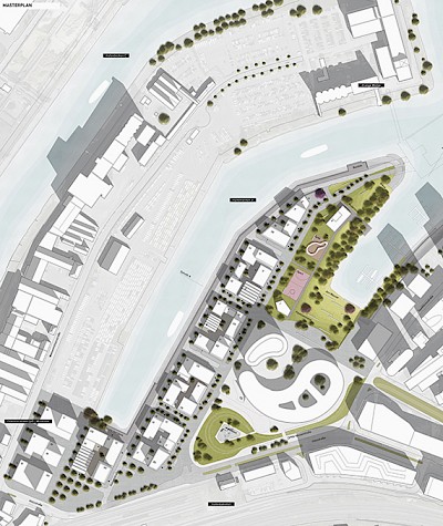 Der städtebauliche Entwurf leitet von den umgebenden großräumigen urbanen Strukturen ein zusammenhängendes Bebauungsband ab, neben dem der Park am Hafen als eigener Raum erfahrbar wird. Ziel dabei ist kein von der gebauten heterogenen Umgebung losgelöste Bebauung und Park – sondern durch den Freiraum ein vielfältiges urbanes Gewebe zu schaffen. Verschiedene Nutzungsschichten werden in Form von „Feldern“ aus der Umgebung abgleitet und in sie eingebettet, untereinander changierende Baumorte defininieren diese Nutzungsfelder und Bedeutungsorte und verbindet sie untereinander.