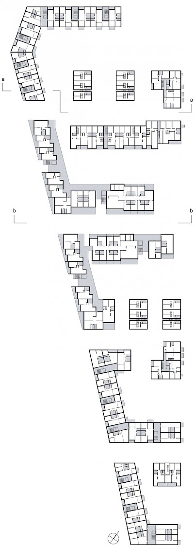 Die Bebauung des Quartiers – bestehend aus Tiefgarage, Erschließungshof und Hochbauten – „schiebt“ sich in die Parklandschaft. Die weichen Räume zwischen den Gebäuden sind einerseits räumlich und gestalterisch Teil des Parks und öffnen sich zu diesem, andererseits bilden sie die halböffentlichen Räume für die Bewohner, vergleichbar mit denen eines klassischen städtischen Blocks. So ergibt sich eine horizontale Verschiebung der konventionellen vertikalen Schichtung – Die Tiefgaragen befinden sich unter den Erschließungsgassen, der „Blockinnenraum“ wird Teil der Landschaft – wird ein „innerer Außenraum“.