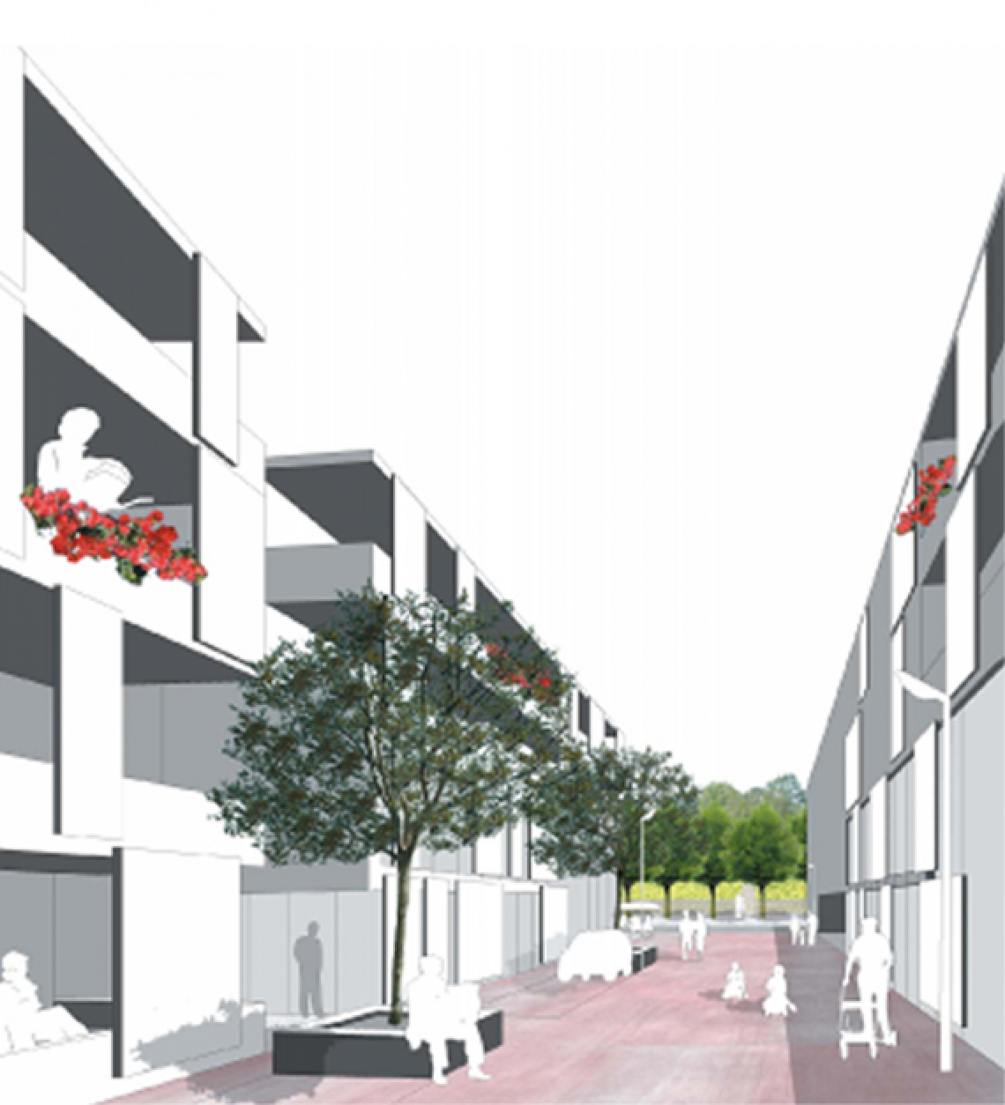 Durch Bäume begleitete Gassen geleiten die Anwohner des neuen und des bestehendes Quartiers in den Park. Die Baukörper an der Parkkante stehen eindeutig für eine Grenze zwischen Park und Quartier – Aber sie wird auch Übergangsraum in die hofähnliche Struktur der halböffentlichen Teilräume des Wohnquartiers.