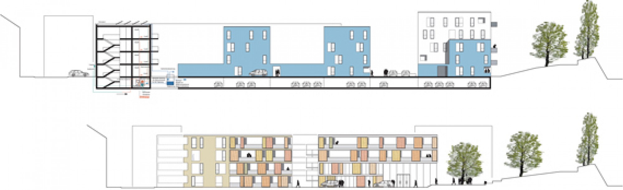 Geprägt wird dieses Freiraumgerüst durch das Landschaftliche Element, welches im Nord-Osten als Schallschutzwall zur Oberbilker Umgehungsstraße ausgebildet ist. Dieser „Lärmschutzwall“ ist als landschaftliche Modellierung Teil des öffentlichen Freiraums – ein Park, der einerseits die bestehende Grünverbindung vom HZ Park, durch die neuen Gewerbebauten im Norden weiter- und über das Schulgelände in die bestehende Struktur hineinführt und andererseits den topographischen Rücken des neuen Quartiers bildet.