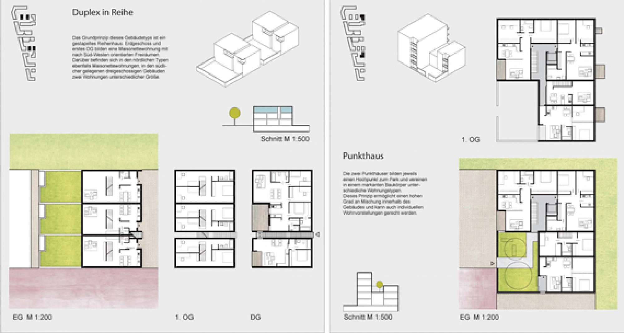 Die Bebauung des Quartiers – bestehend aus Tiefgarage, Erschließungshof und Hochbauten – „schiebt“ sich in die Parklandschaft. Die weichen Räume zwischen den Gebäuden sind einerseits räumlich und gestalterisch Teil des Parks und öffnen sich zu diesem, andererseits bilden sie die halböffentlichen Räume für die Bewohner, vergleichbar mit denen eines klassischen städtischen Blocks. So ergibt sich eine horizontale Verschiebung der konventionellen vertikalen Schichtung – Die Tiefgaragen befinden sich unter den Erschließungsgassen, der „Blockinnenraum“ wird Teil der Landschaft – wird ein „innerer Außenraum“.