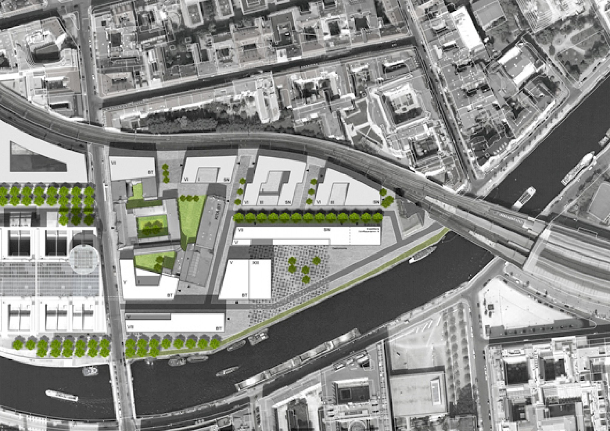 Der Stadträumliche Leitgedanke des Spreebogens wird kritisch hinterfragt, und mit einer eigenen Haltung zur Stadt, der östliche Abschluss des Band des Bundes als öffentlicher Raum geschaffen.