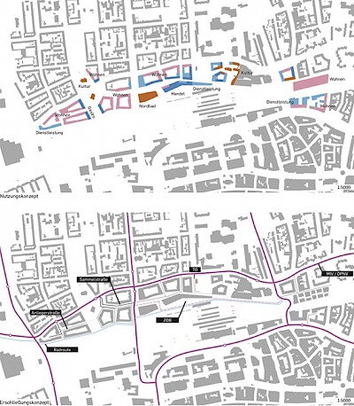 Das Weiterbauen des Bestehenden ermöglicht aufgrund der robusten Struktur eine große Nutzungsvarianz. Was heute als kleine Ladeneinheiten gedacht wird, kann übermorgen als Wohnen weiter Bestand haben. Einzelne Baukörper verorten besondere Orte im Stadtgrundriss: Der Auftakt ins Quartier im Westen und Osten, das neue „Bahnhofsgebäude“ am Bahnhofsplatz mit seinen Infrastrukturfunktionen auf Stadt-, und Bahnebene, Hochpunkte an den „Stadttoren“ der Schützenstraße und der Leopoldstraße.