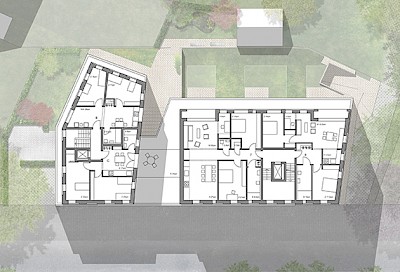 BAUKÖRPER - Der Baukörper bildet zwei eigene Bereiche, einen intimen, innenhofartigen Bereich vor dem südlichen Zugang und einen offeneren Bereich des Wohnungsbaus an der Straße. Erschlossen werden beide Wohnbauteile jeweils durch eine eigene Spännererschließung und beide Teile folgen einer eigenen inneren Logik. Zugleich sind sie aber, in einer Nutzungsalternative als ein zusammenhängender Wohnungsbau zu verstehen und mit einer internen Zonierungsachse strukturiert.