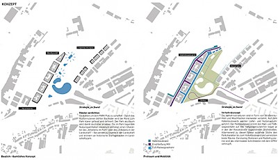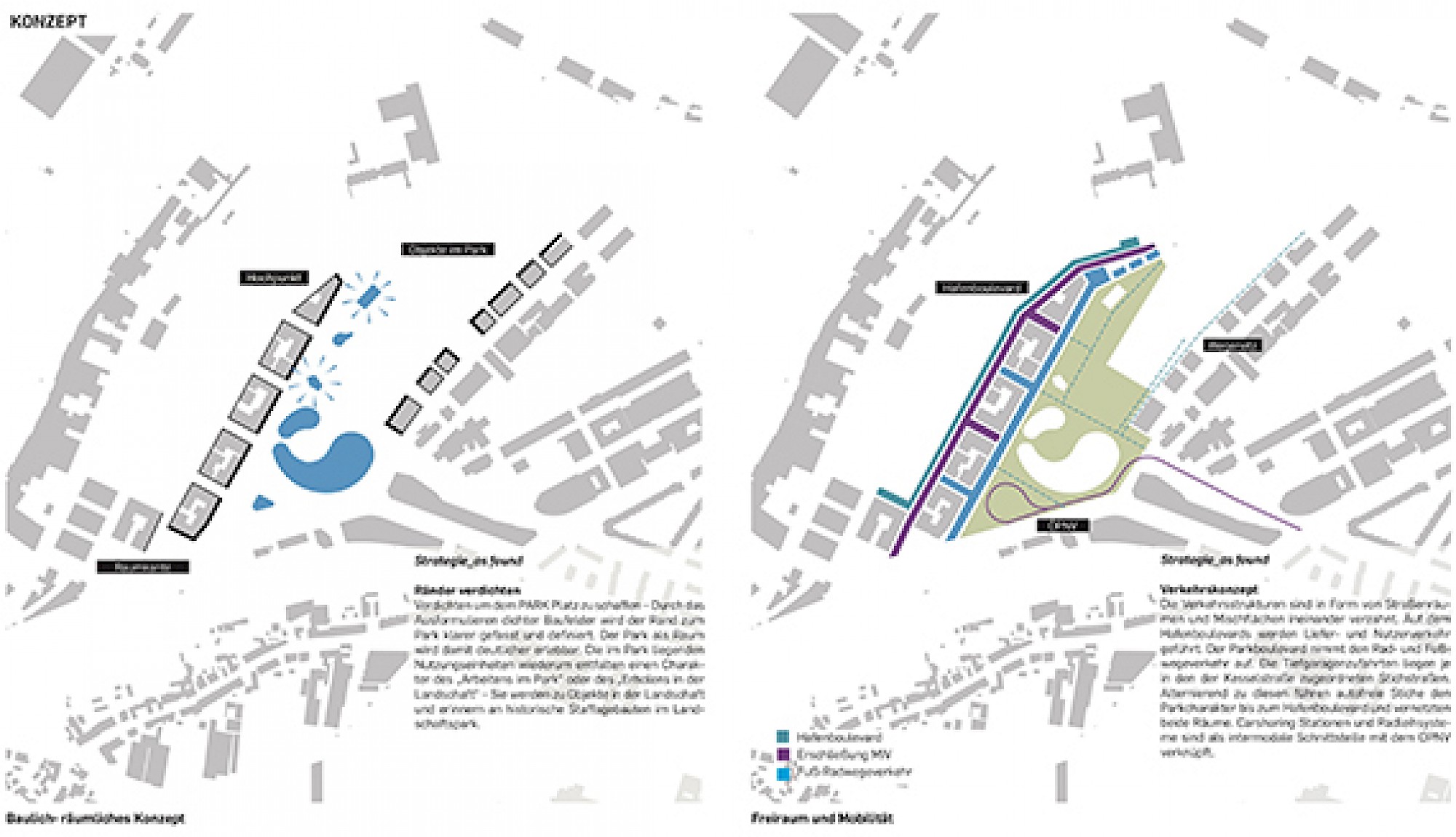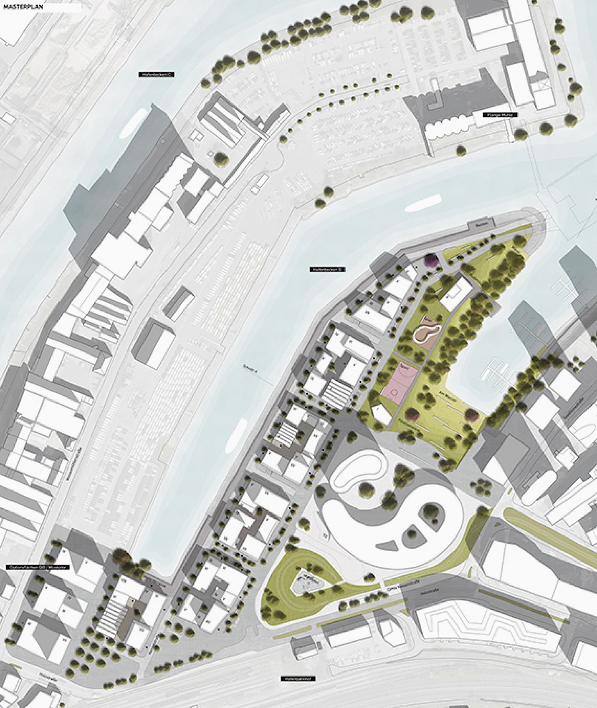 Der städtebauliche Entwurf leitet von den umgebenden großräumigen urbanen Strukturen ein zusammenhängendes Bebauungsband ab, neben dem der Park am Hafen als eigener Raum erfahrbar wird. Ziel dabei ist kein von der gebauten heterogenen Umgebung losgelöste Bebauung und Park – sondern durch den Freiraum ein vielfältiges urbanes Gewebe zu schaffen. Verschiedene Nutzungsschichten werden in Form von „Feldern“ aus der Umgebung abgleitet und in sie eingebettet, untereinander changierende Baumorte defininieren diese Nutzungsfelder und Bedeutungsorte und verbindet sie untereinander.