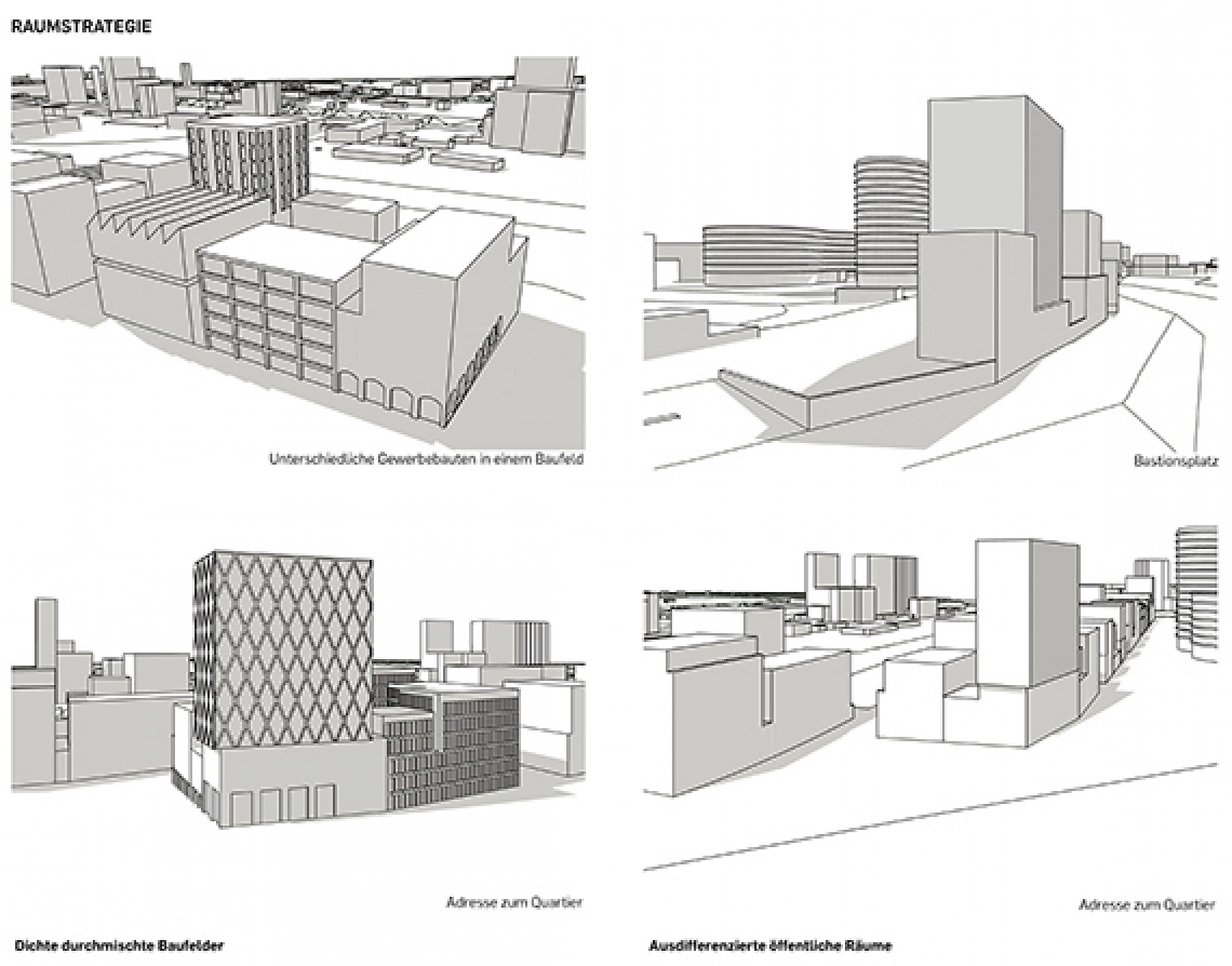 Die Baufelder sind so dimensioniert, dass eine vielfältige Bebauung in Offenen Blöcken und in Solitären denkbar ist und ein vitaler Typologiemix und eine große Nutzervielfalt aufgenommen werden kann. Sie sind flexibel, in zeitlichen Stufen zu entwickeln und können je unterschiedlich ausgeformt werden. Die Mischung aus fünf- bis achtgeschossigem Bürogebäuden, Punkthäusern und „gestapelten Hallen“ erzeugt in der Variation der Grundrisse vielfältige Arbeitswelten. Diese Variationsoffenheit erzeugt die planerische Sicherheit für eine zielgerichtete als auch marktorientierte Entwicklung der einzelnen Teilquartiere