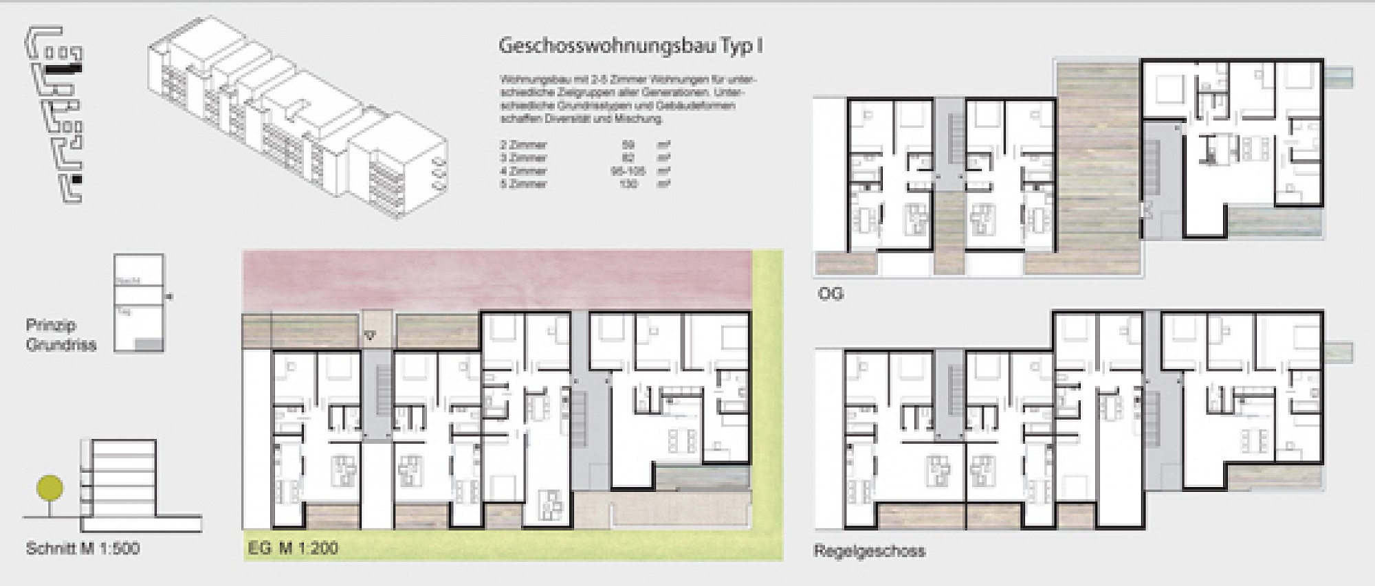 Die Bebauung des Quartiers – bestehend aus Tiefgarage, Erschließungshof und Hochbauten – „schiebt“ sich in die Parklandschaft. Die weichen Räume zwischen den Gebäuden sind einerseits räumlich und gestalterisch Teil des Parks und öffnen sich zu diesem, andererseits bilden sie die halböffentlichen Räume für die Bewohner, vergleichbar mit denen eines klassischen städtischen Blocks. So ergibt sich eine horizontale Verschiebung der konventionellen vertikalen Schichtung – Die Tiefgaragen befinden sich unter den Erschließungsgassen, der „Blockinnenraum“ wird Teil der Landschaft – wird ein „innerer Außenraum“.