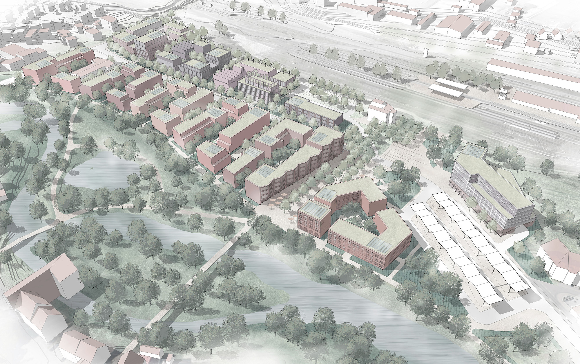 Entwicklung der ehemaligen Infrastrukturfläche des Bahnhofsumferldes. Das Quartier verbindet die Kernstadt und den Bahnhof - schafft mit Hochschul- Gewerbe- und Wohnbauten ein lebendiges Quartier an den Flussauen. Direktauftrag im Rahmen einer Mehrfachbeauftragung, Crailsheim, 2023-2024